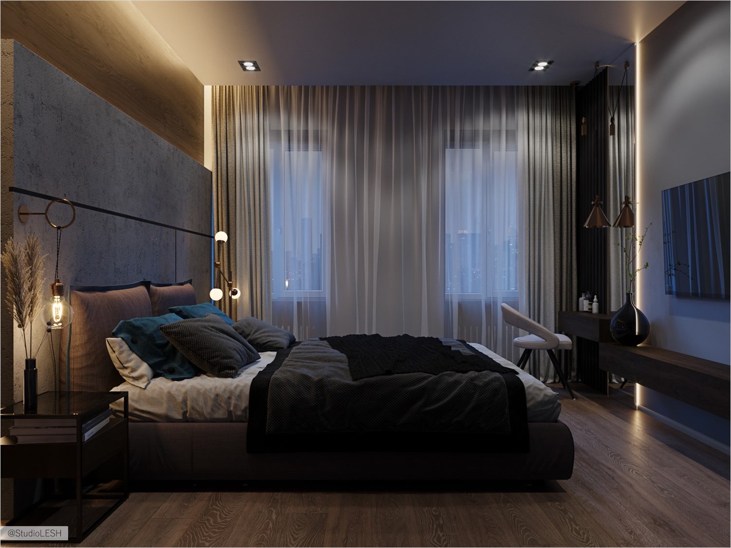 В данном проекте используются разнообразные сценарии освещения, так мы например видим, что в спальне может быть как романтический приглушенный свет от настольных дизайнерских ламп из коллекций Tilt и Wallring, так и атмосфера сумерек благодаря подсветке за декоративной конструкцией с элементами лофт.