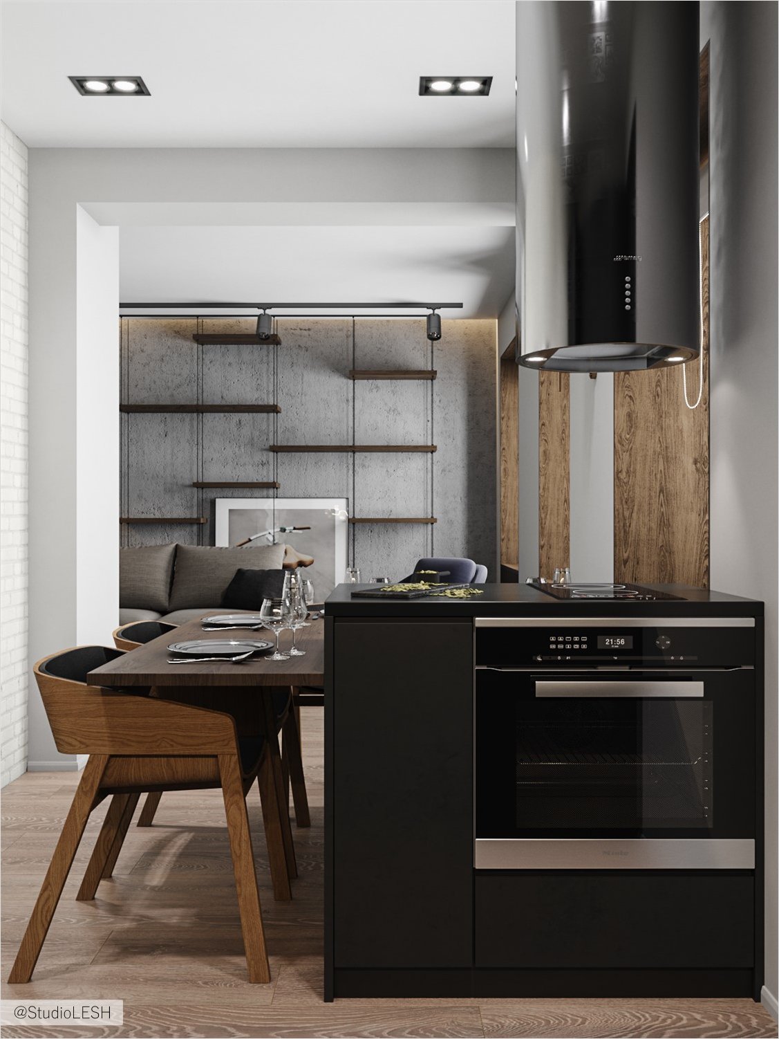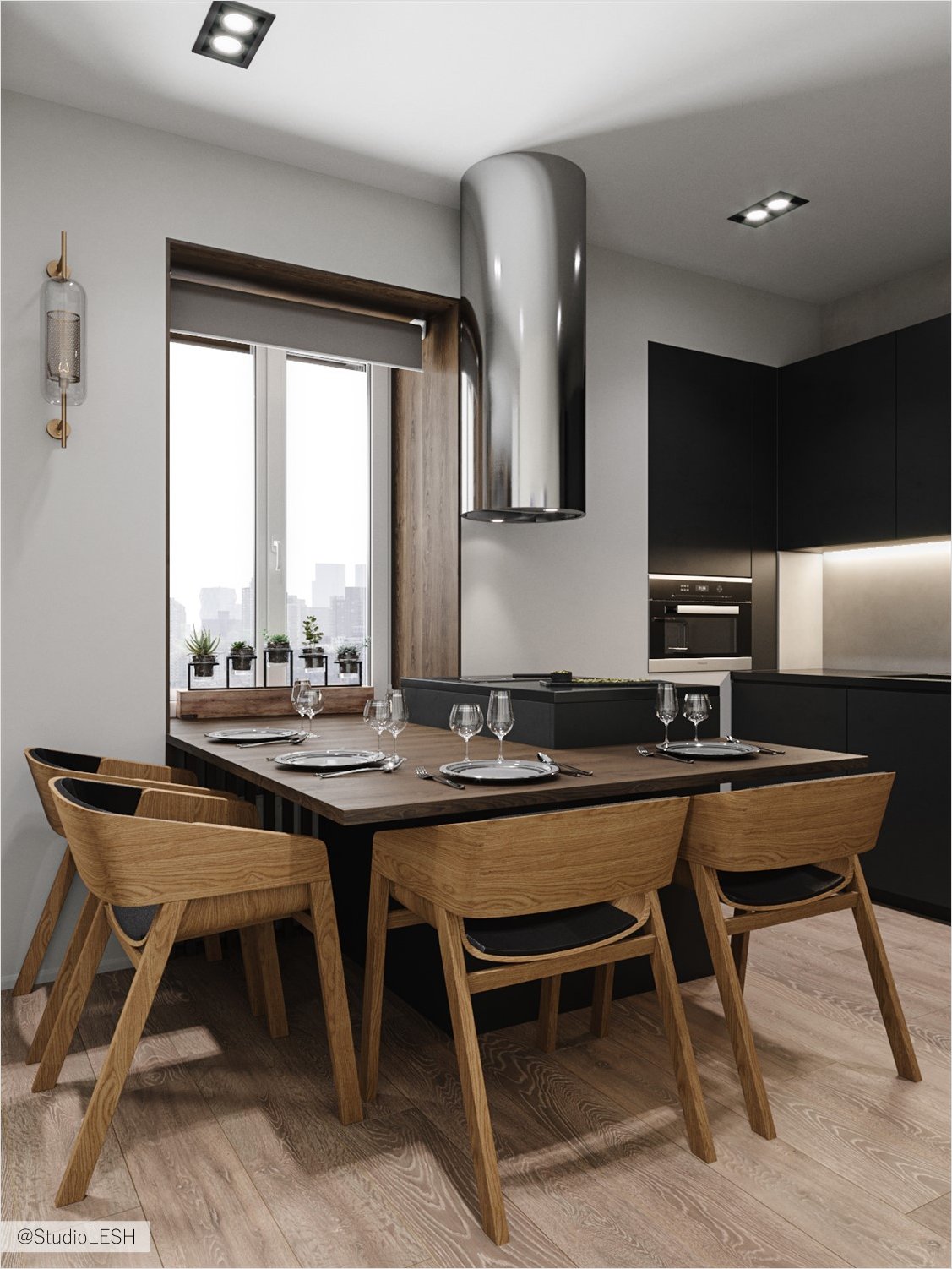 В рамках данного проекта кухонный остров стал продолжением компактного кухонного гарнитура на довольно маленькой кухне - всего 8 м², и одновременно стал обеденной зоной, что сделано кухню уникальным объектом, который выполняет несколько функций одновременно.