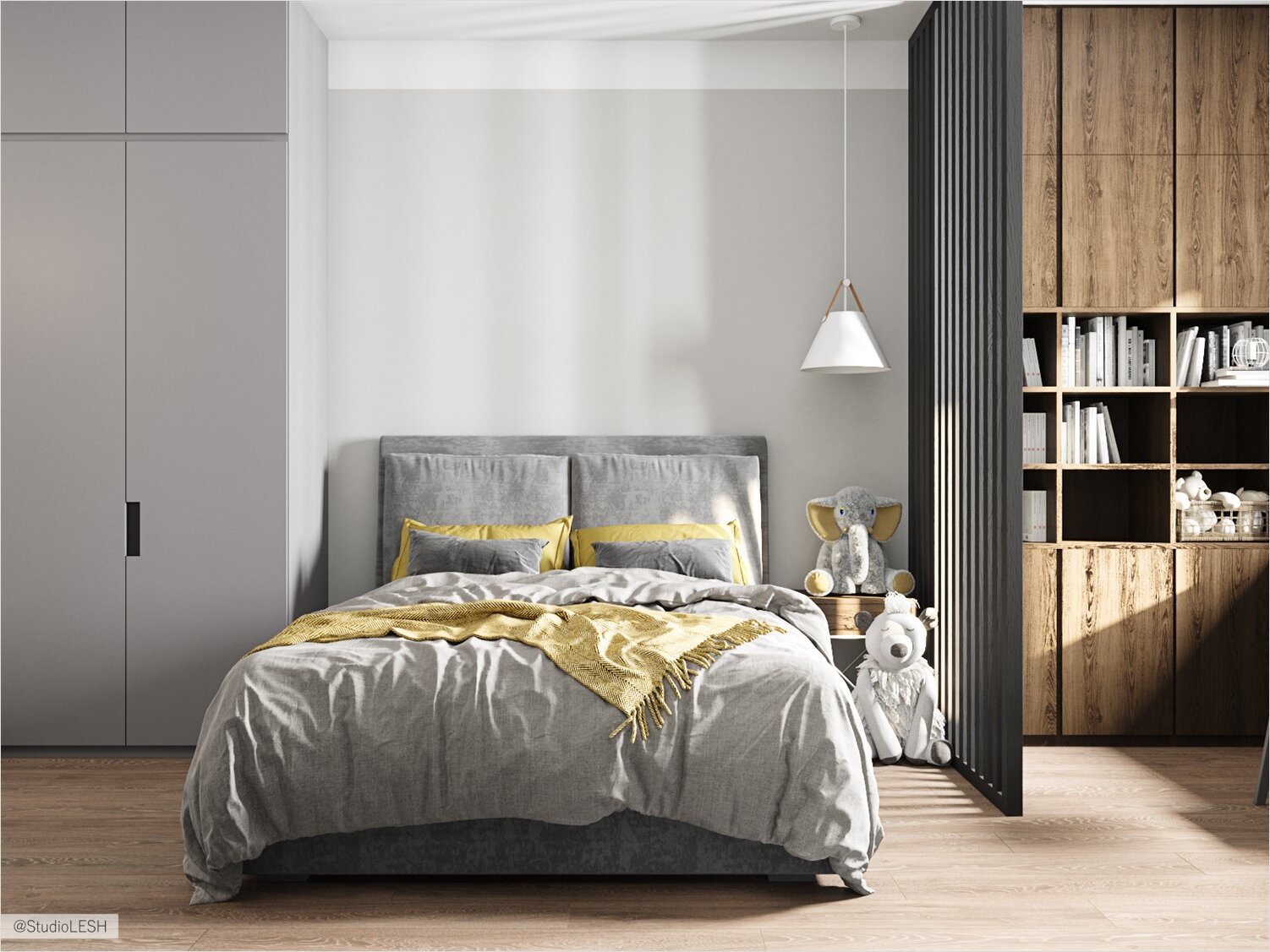 Также конструкцией сделанной из деревянных реек выполнено зонирование в детской комнате, здесь комната делится на спальную зону и рабочую зону, но при этом в комнате много естественного света.