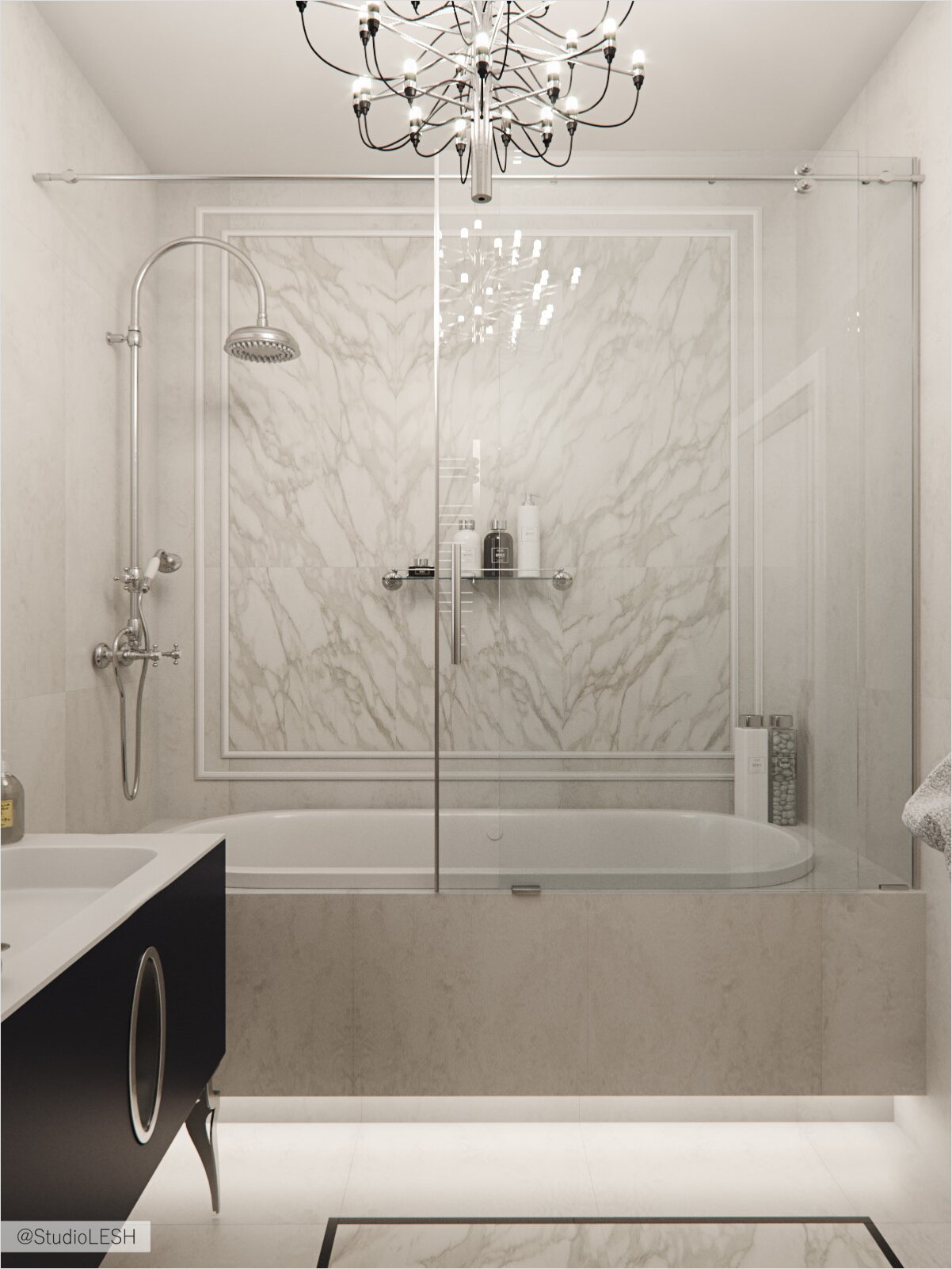 We choose white colours for visual expansion of the bathroom. The sink was cutting in for comfort exploitation, and choose classical plumbing and marble countertop in order to emphasize the style. The bath separated by glass curtain for creation of airiness and visually ease the space.