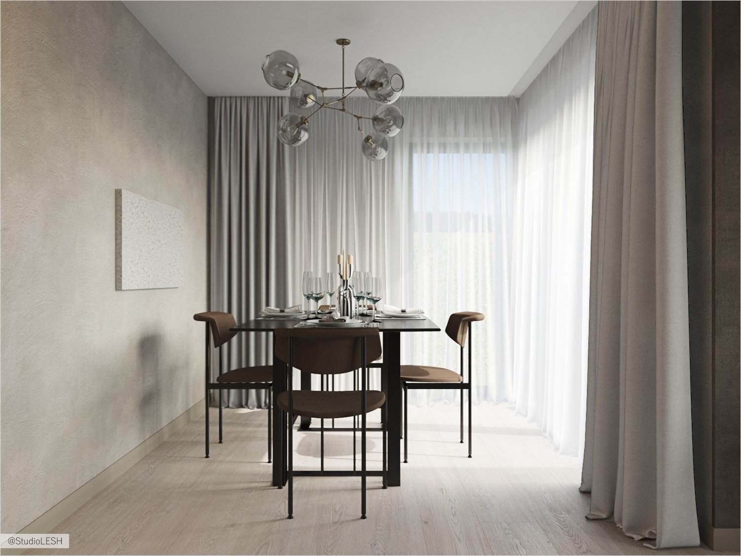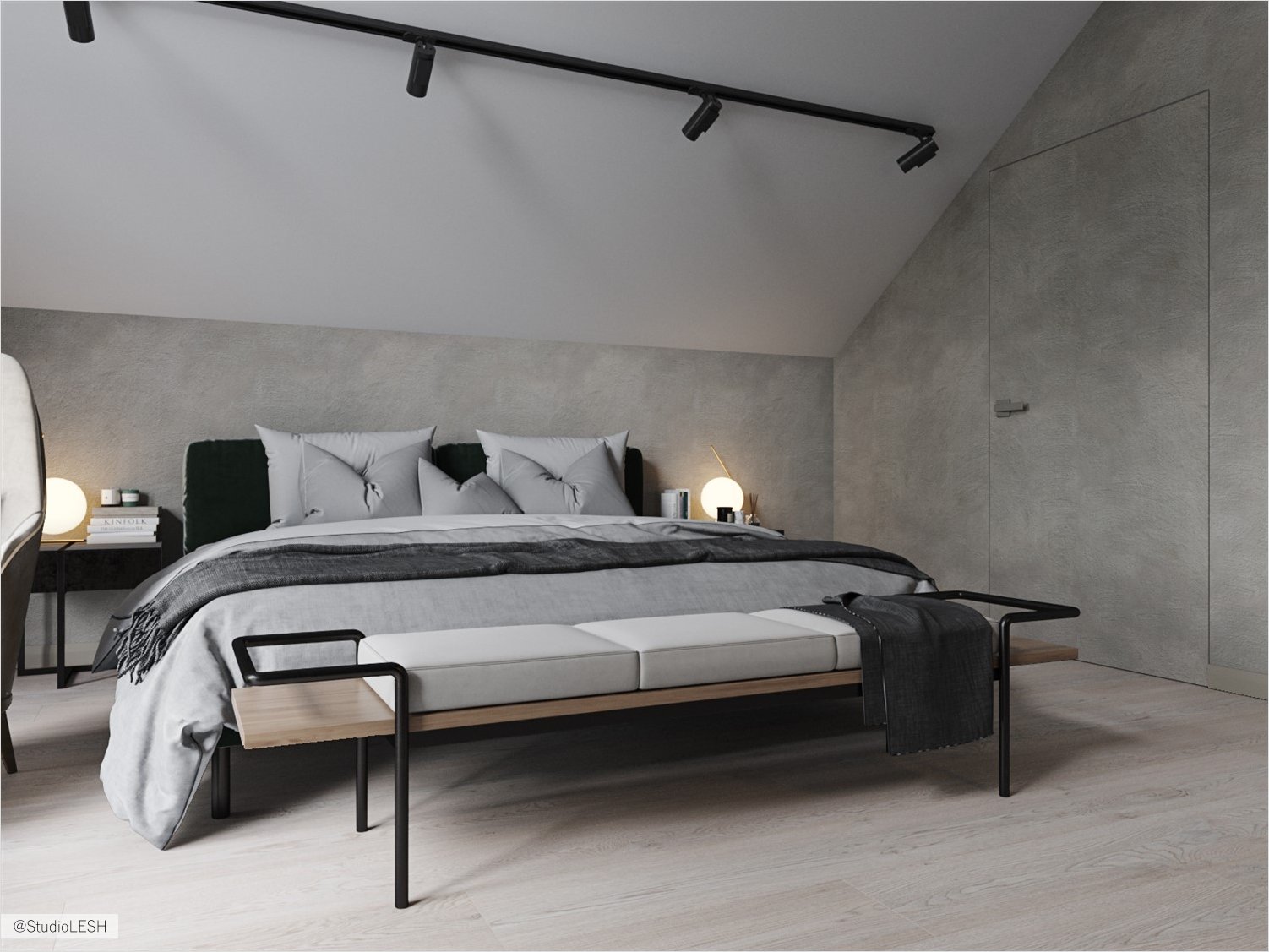 Through the discussion about an organization of this floor there was a decision about the development of straight cornice with a curtain for the opportunity to make a private space at the bedroom and at the bathroom. The construction of the cornice imply the move only half of curtain, at the same time another half always stay in stable position - it was made because of the unusual form of ceilings on the floor and the necessity of stable fastening of the curtain half for the stability of the construction.