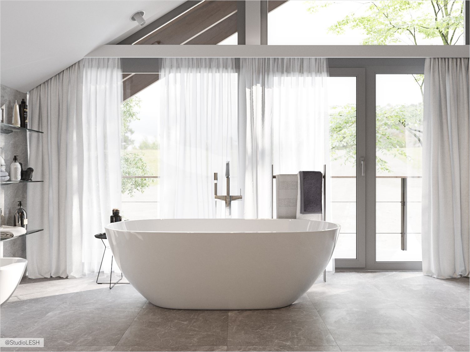 The bathroom is located on the third floor and its’ square is really big, for making there a different space for the rest. Here we place full-fledged SPA zone with full-sized sauna, spacious shower, storage zone for different bath stuff and free-standing bath with a good view.