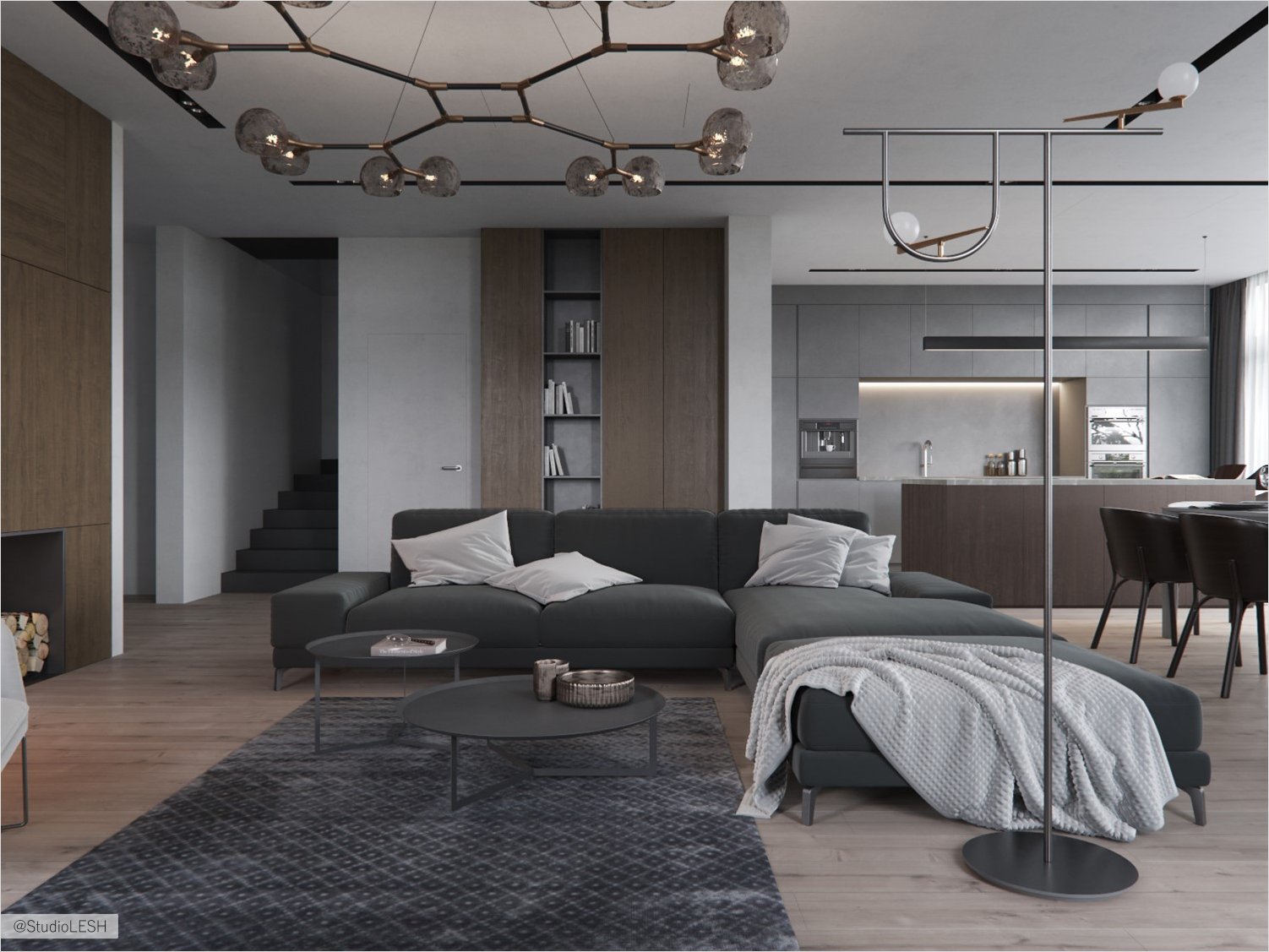 The client has a wish: a real fireplace in the living room. The installation of such a fireplace needs strong extraction and the place for waste from burning. At this project, we choose the device that is assembled in the wall and made under the structure of the wardrobe in the living room. The fireplace lined with metal lists and the glass in the front, it allows to enjoy the fire and have the warmth.