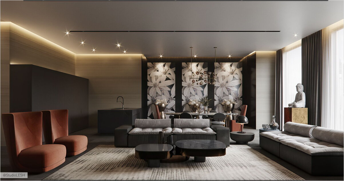 To sum up, we can say that the interior turned out to be quite consistent with the author's style, which combines the gift of creating luxury interiors with the client's life scenario, understanding of their comfort zones, and life habits. The signature style of Studio LESH founder Michael Mohr is luxurious minimalism with an optimal number of elements, but where each item is a real work of art. In all zones, there are details that have a special magnetism that attracts the admiring gaze and make you freeze in contemplation of the beautiful. However, despite the tendency to luxury elements against the background of restrained color and texture solutions, the author observed a key rule — all efforts should be aimed at harmonizing the client's desires and their future daily comfort.