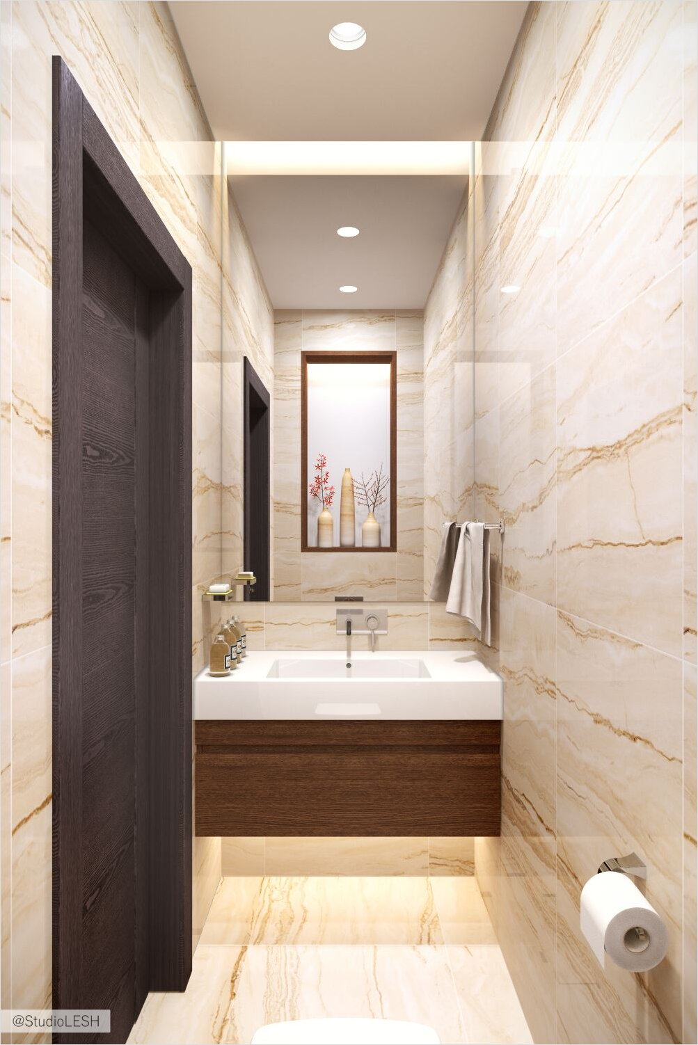 Санузел оформлен керамогранитом в тёплых тонах с выраженной фактурой. Инсталляция и трубы зашиты гипсокартоном, благодаря чему появилась ниша, которую можно впоследствии декорировать на усмотрение хозяев дома. Напротив унитаза - тумба с раковиной, за ней - зеркало до потолка со светодиодной подсветкой. Смеситель встроен в стену.