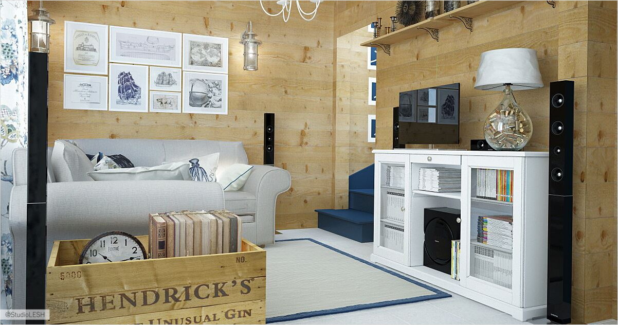 Так же интерьер загородного дома разбавлен морской тематикой, это выражено в использовании глубокого синего цвета, а так же элементов декора, с использование морских узлов, картин на морские темы в зоне отдыха, да и сам открытый брус стен ассоциируется с корабельной обшивкой.