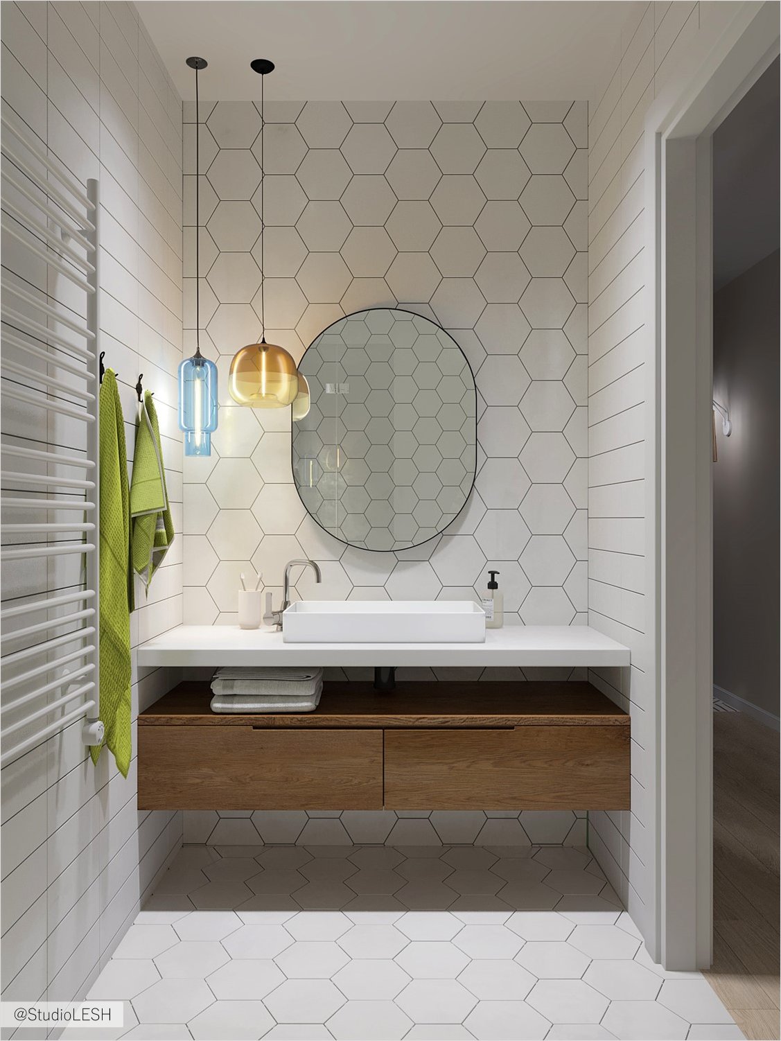 Учитывая общую стилистику квартиры необходимо было выбрать такой формат плитки, чтобы цвет стен оставался нейтральным, но при этом поддерживал ритм заданный во всей квартире. Таким образом была выбрана плитка-мозаика выполненная в различных геометрических формах, чтобы сохранить атмосферу созданную в других комнатах и одновременно создать уникальный дизайн в каждой из комнат.