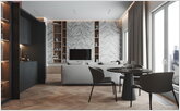 В студию обратился солидный мужчина, чтобы заказать дизайн-проект своей квартиры. На площади в 77 м² было решено спроектировать: объединенное пространство прихожей-кухни-гостиной, спальня, гостевая комната, и один санузел. Стилистика квартиры выдержана в современном стиле, нужно было создать удобное, комфортное пространство современной городской квартиры.