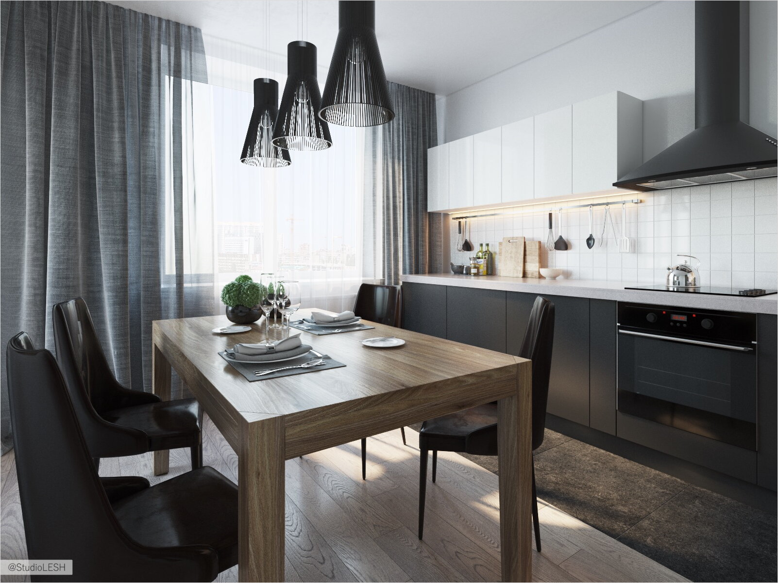 Шкафы черного цвета снизу и белые наверху словно разрезают пространство напополам. Деревянный стол и современные темные стулья поддерживают нижние фасады. В интерьере кухни отчетливо просматривается вся строгость мужского характера.