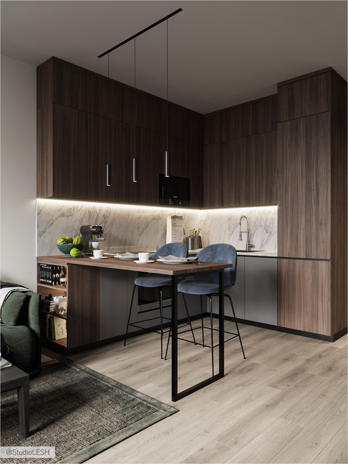 В данном случае стол имеет много функций: в первую очередь от отделяет кухонную зону от гостиной, а также может быть использован как дополнительное место готовки. Столешница выполнена из дерева глубокого темного цвета, которая сочетается с фасадами кухни и придаёт статусности всему помещению.