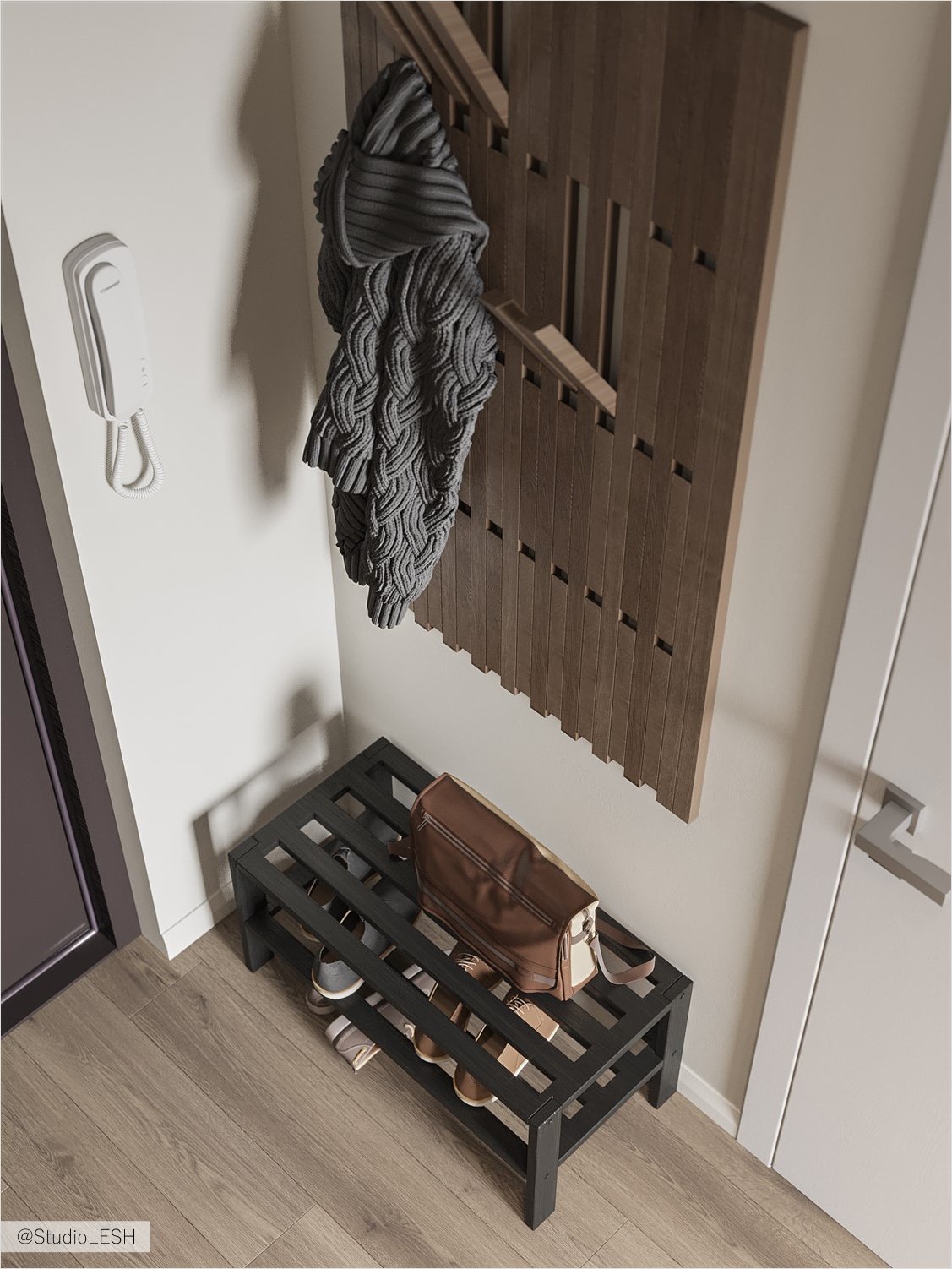 Она представляет собой деревянную панель с выдвижными деталями, которые в итоге становятся крючками для одежды и каждый из них выдерживает вес до 3,5 кг. Вешалка выполнена из темного дерева и соответствует общей стилистике квартиры.