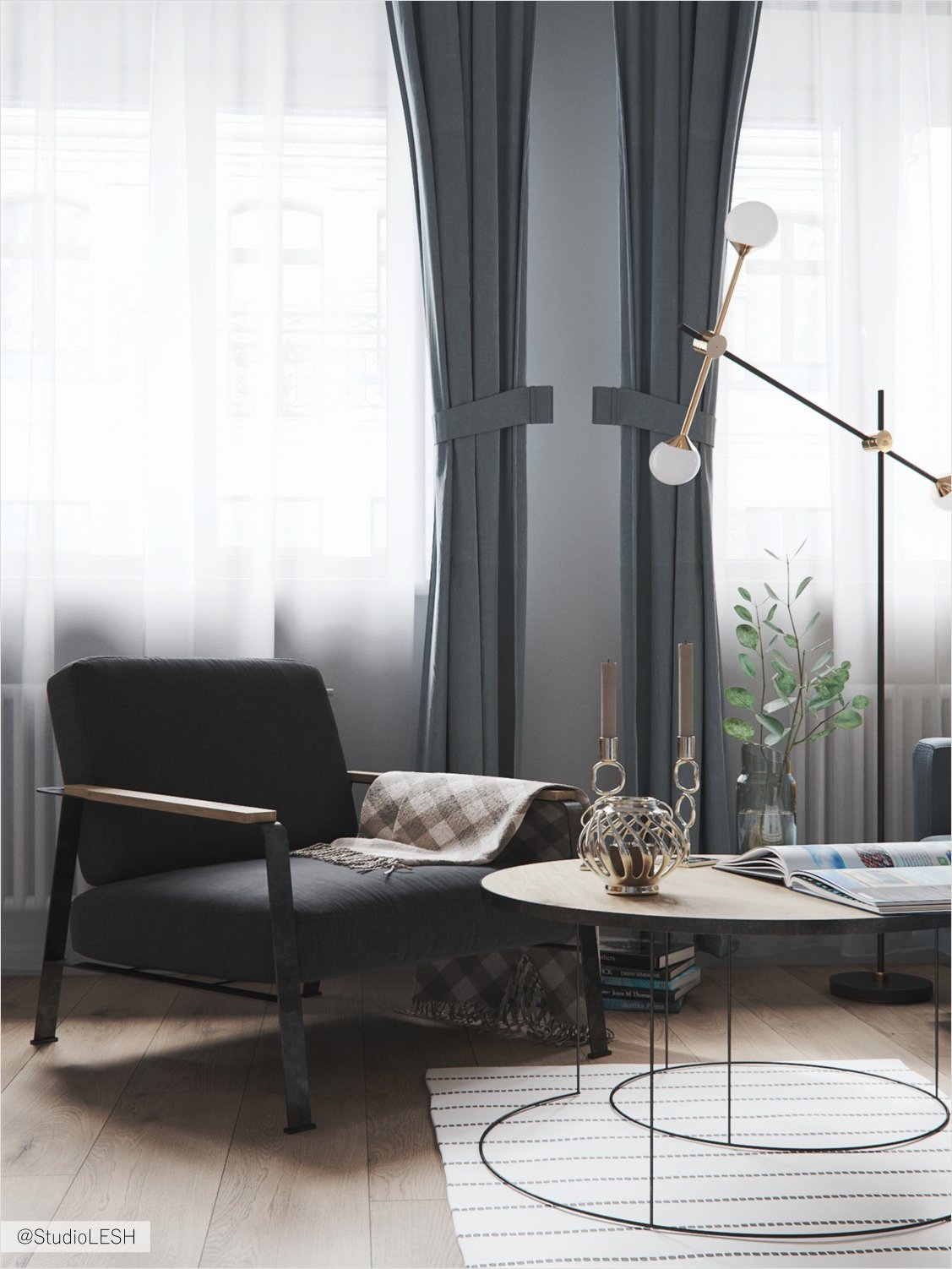 Дизайн квартиры выполнен в скандинавском стиле для которого характерны использование спокойных оттенков и натуральных материалов. Здесь были использованы сочетания синего, серого и коричневого цветов в различных тонах и с разным уровнем насыщенности цвета.