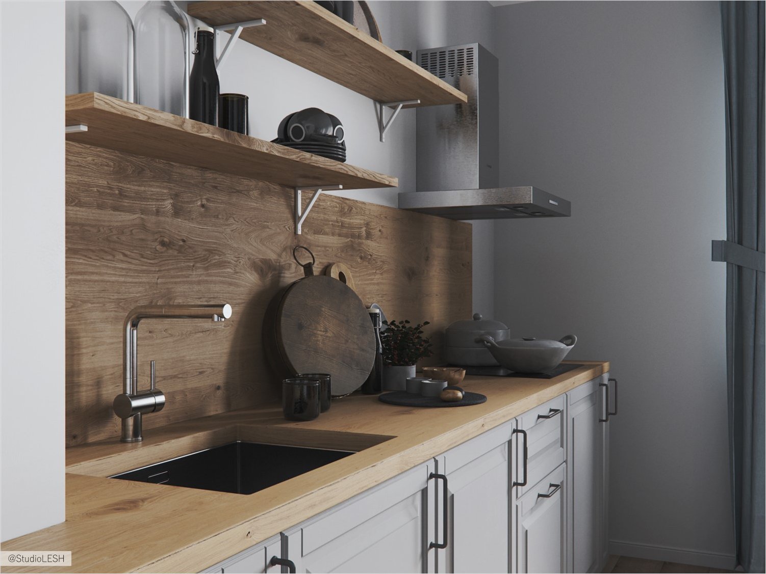 Скандинавский стиль подразумевает использование деревянных элементов в интерьере квартиры. Именно поэтому на кухню была выбрала столешница и фартук из дерева, для поддержки основной стилистики квартиры.