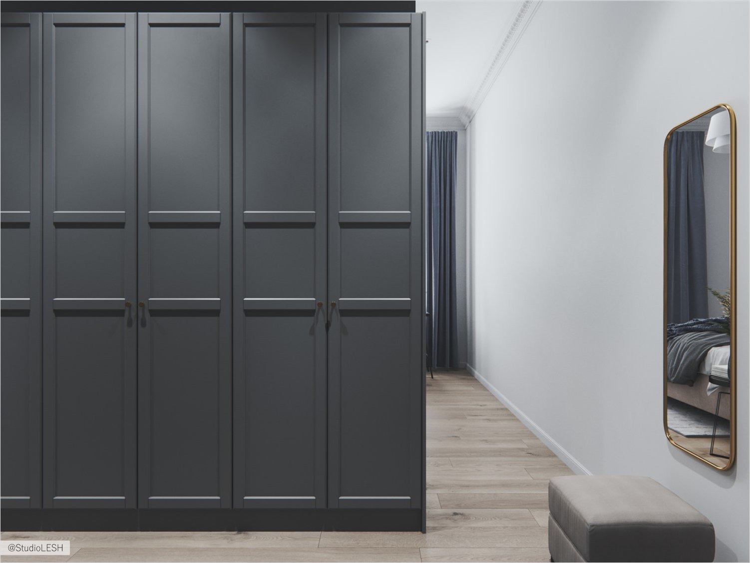 В изголовье кровати была построена перегородка, в которой сделаны проходы по обеим сторонам для вентиляции гардеробного помещения. Сама гардеробная находится за этой перегородкой и представляет собой закрытую систему хранения, состоящую из шкафов от пола до потолка. В гардеробной есть каркасный пуф из коллекции Swede и винтажное зеркало в полный рост в латунной рамке, что объединяет стилистику гардеробной со спальней.