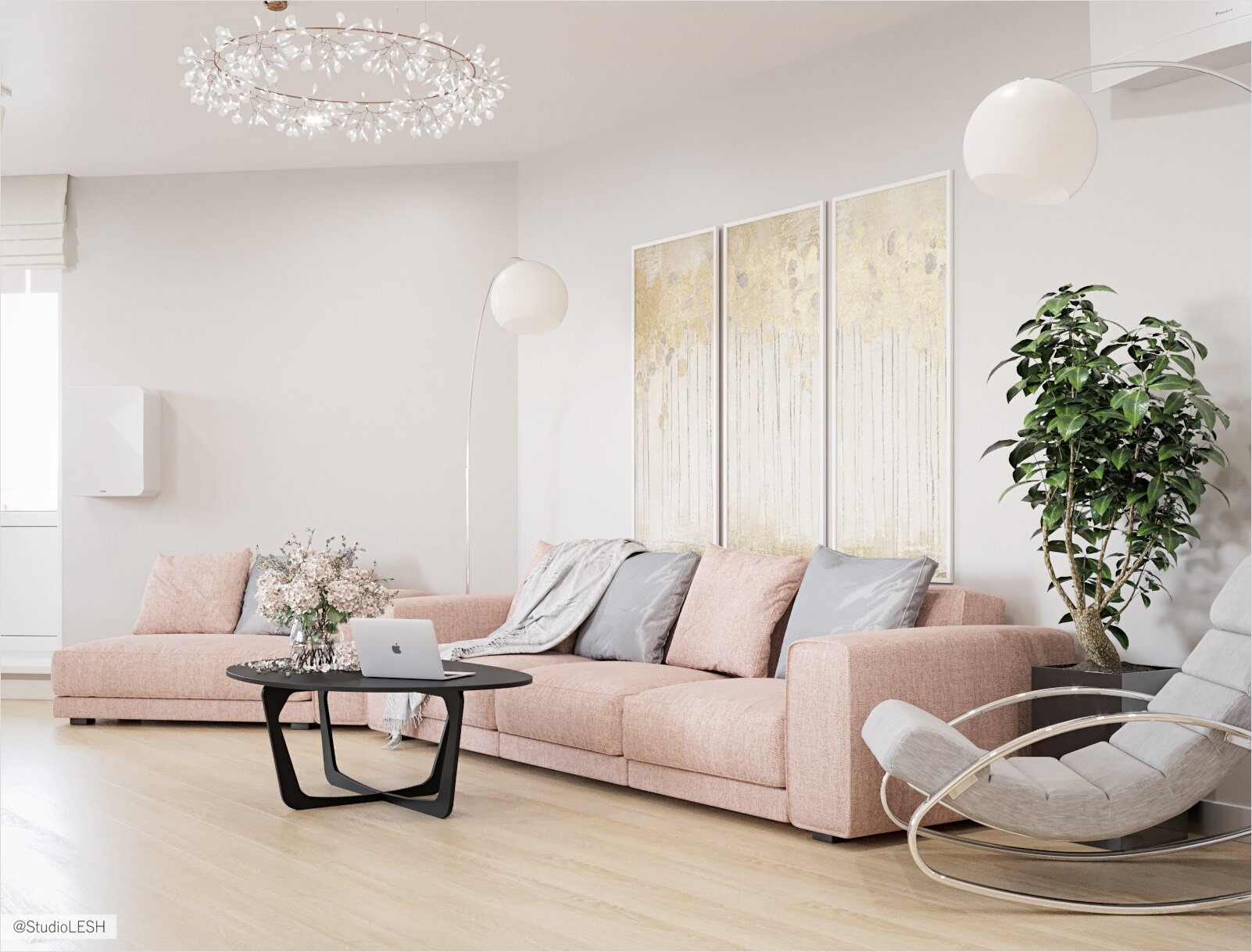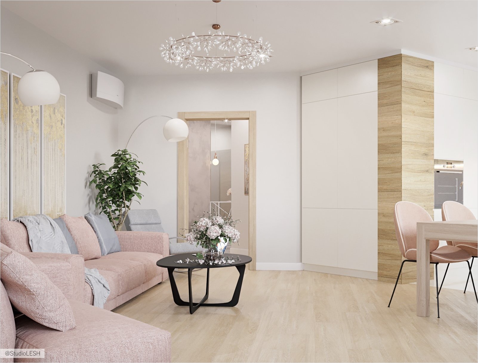 Стены во всех комнатах и помещениях светлые. Использовано три основных цвета: бежевый, серый и белый. При этом сделаны и цветовые акценты, для них использованы оттенки салатового, пудрового и фиолетового цветов. Мебель и текстиль, подобранные в той же цветовой гамме, удачно вписываются в интерьер. Материалы использованы натуральные, что делает помещение более живым, а за счет светлых и пастельных тонов пространство расширяется. Атмосфера при этом создается мягкая, уютная и теплая.