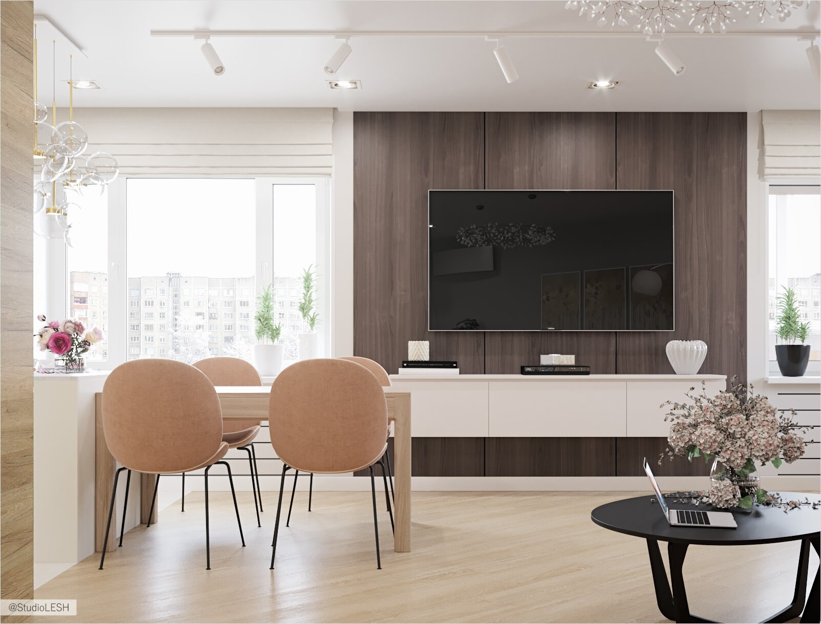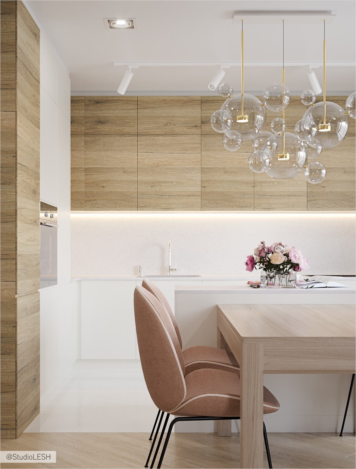 В большой квартире и кухня большая – это плюс, но не всегда такое пространство люди используют правильно. Иногда бывает так, что кухня по своему дизайну сильно отличается от всей остальной квартиры, что создает ощущение неуютности. Мы же постарались сделать кухню такой же современной и с нотками скандинавского стиля, как и вся квартира. Она не должна была выделяться на общем фоне, при этом мы стремились сделать ее максимально комфортной, лаконичной и простой.