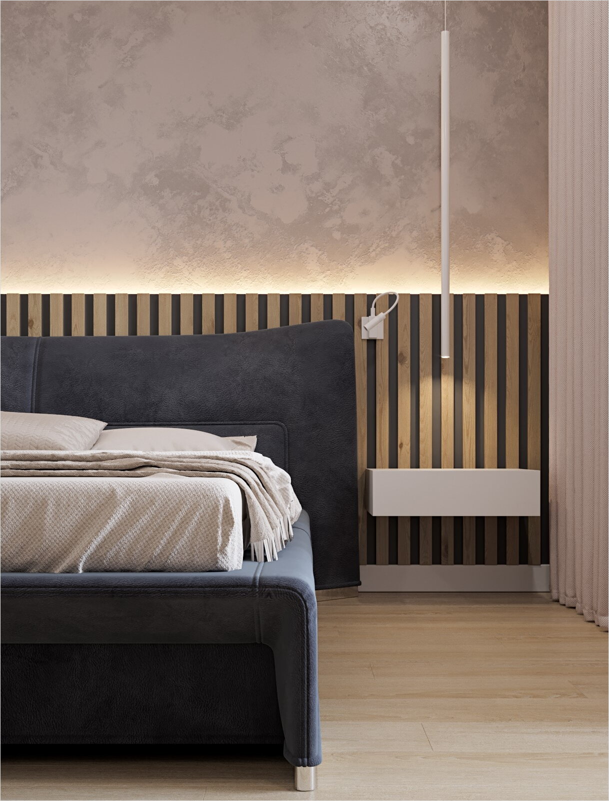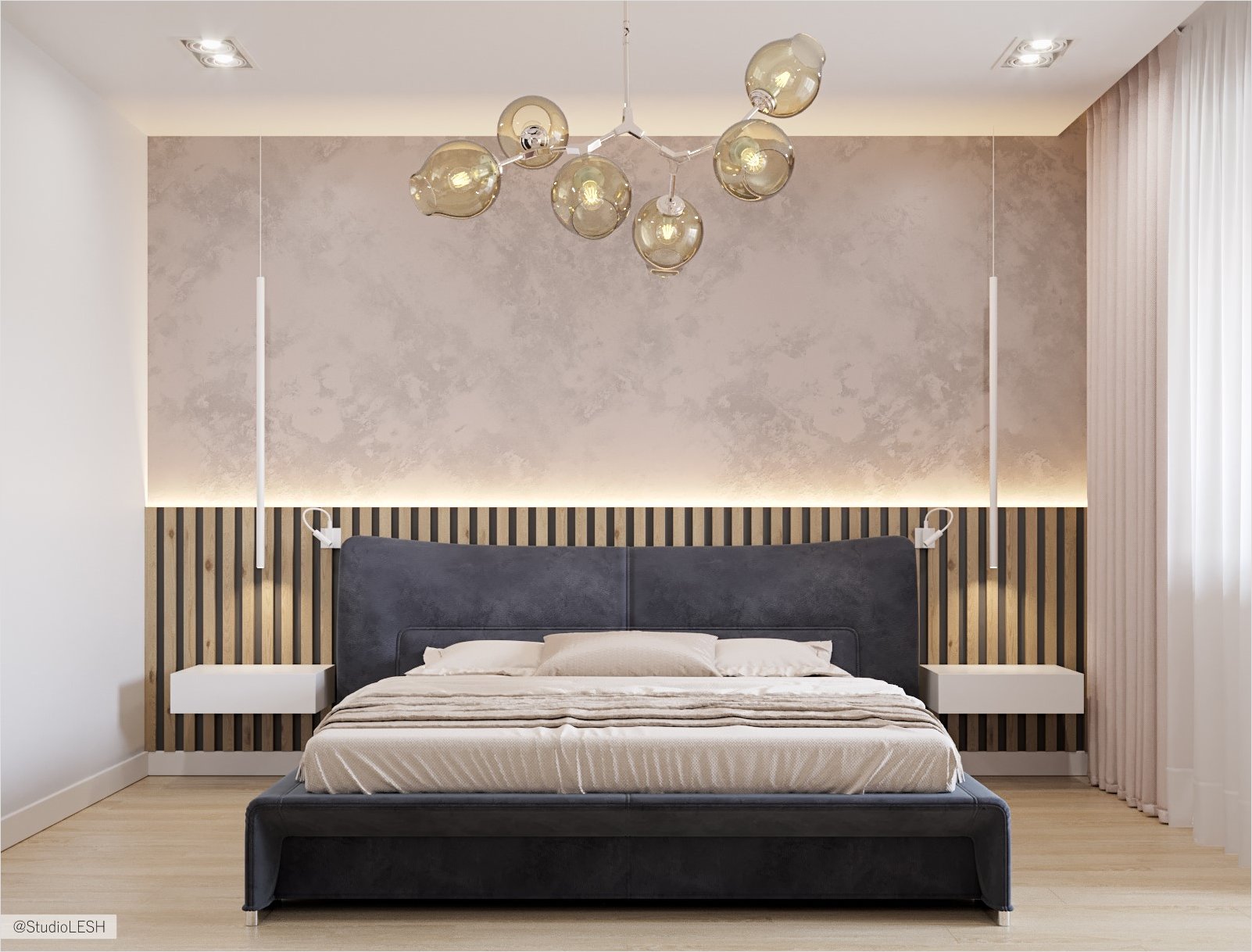 Обычно в зоне изголовья кровати остается голая стена. Иногда ее украшают картинами, но это слишком банально, потому мы решили установить там деревянные рейки, придающие ритм интерьеру. А сам материал – дерево – делает общую атмосферу более уютной, мягкой и теплой. А если захочется добавить таинственности в вечернее время, можно воспользоваться спрятанной за декоративной панелью декоративной штукатуркой с подсветкой. Немного динамики комнате добавляют подвесные светильники. Как и вся остальная часть квартиры, спальня тоже выполнена в светлых тонах.