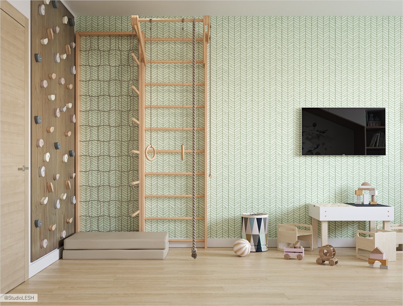 Мы установили в комнате скалодром – тренажер, помогающий ребенку развивать силу, выносливость, цепкость пальцев рук, упорство в преодолении трудностей, стрессустойчивость. Кроме того, это прекрасный способ потратить энергию с пользой, даже не выходя из дома и под присмотром родителей. А маты, разложенные на полу в спортивной зоне комнаты, обеспечивают безопасность во время активных игр.