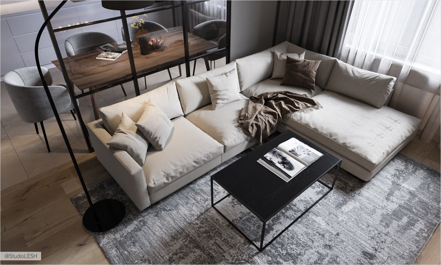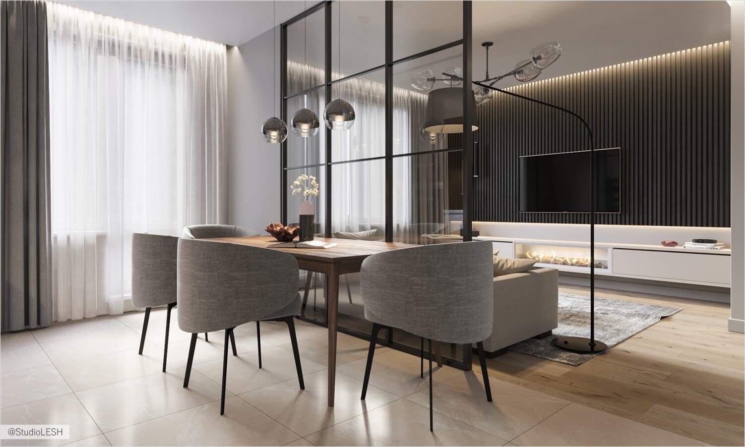 Для воплощения данной задумки было придумано максимально возможное количество сценариев света для оформления интерьера. Здесь мы видим подсветку панели за телевизором, подсветка скрытых карнизов, выделение светом обеденной зоны светильниками бренда Maytoni коллекции Fermi и мягкой зоны выделенной торшером бренда Ideal Lux из коллекции Daddy Nero.