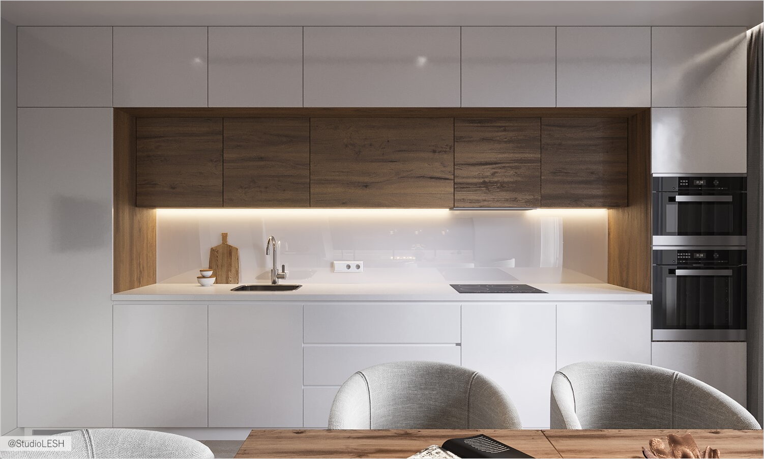 В данном проекте гармонию создают несколько стилей, а именно: минимализм и скандинавский стиль. Для единства общей композиции используются простые формы, прямые линии, гладкие фасады и минималистичная мебель.