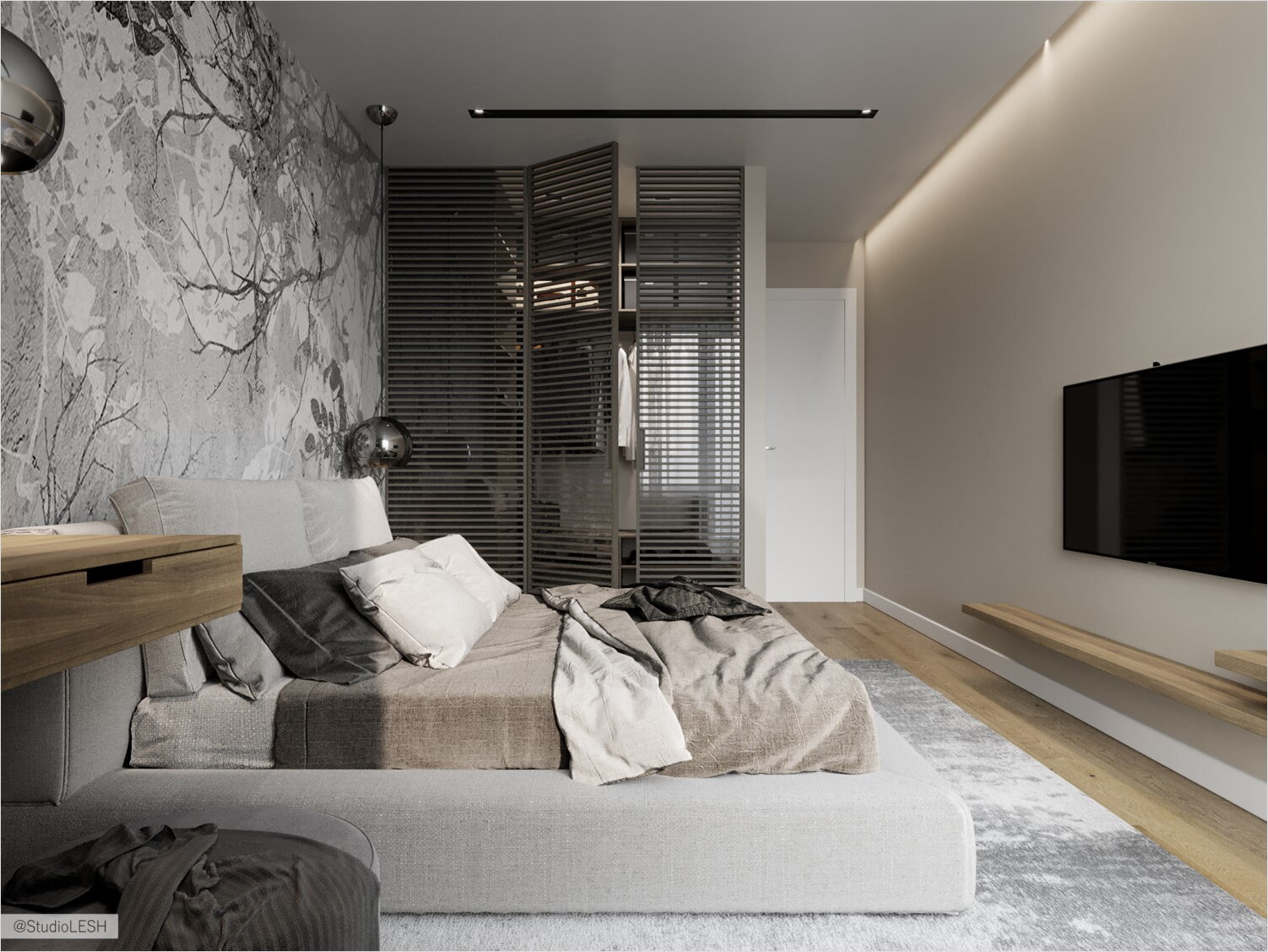 Такая задача была решена следующим образом: в комнате появилась гардеробная ниша, которая отделена от комнаты жалюзийными перегородками из дерева, что одновременно сохранило простор комнаты за счет проникающего естественного света в гардеробную и за счет зонирования сделало спальню более квадратной формы.