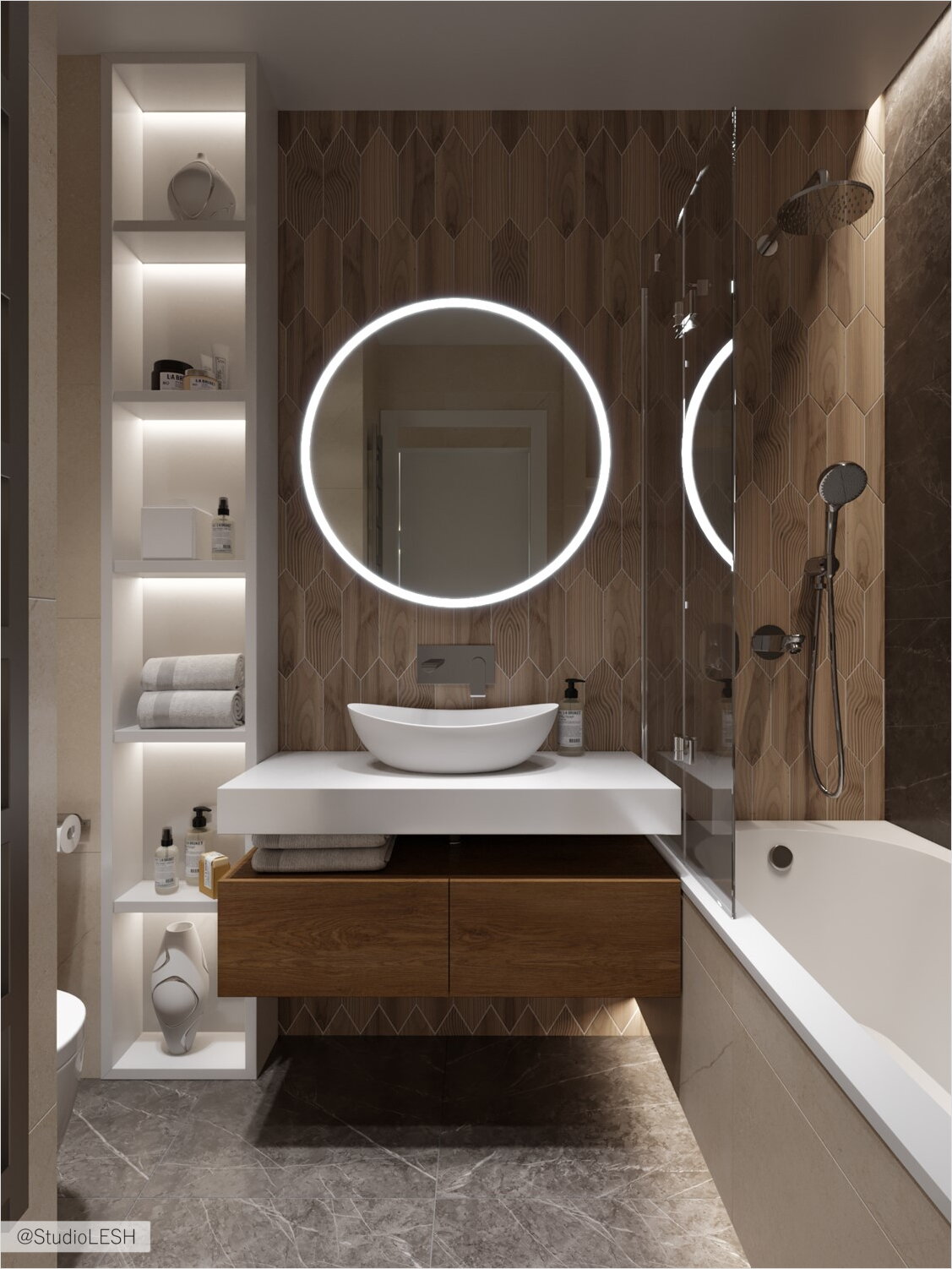 В ванной комнате подсвечиваются полки в стеллаже, круглое зеркало сделанное на заказ и стена отделанная плиткой бренда Atlas Concorde из коллекции Marvel Grey Stone. Также за счет подсветки создаётся парящий эффект самой ванны, что позволяет создать чарующую атмосферу в комнате. Подсветка может быть разделена на разные уровни и выделять определенные зоны в интерьере.