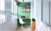 Как и другие комнаты кабинет объединен с балконом, однако из-за особенностей дома, полностью демонтировать стену было невозможно. Поэтому мы решили обыграть часть стены как рабочий стол, таким образом мы решили сразу две проблемы: расстановки мебели и зонирования.