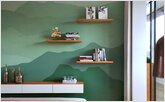 В дизайне спальни присутствуют легкие восточные мотивы. Как известно восток полон загадок и тайн, эта атмосфера распространяется и на интерьер. Противоположная кровати стена является акцентной в интерьере и, за счет цветового решения, сохраняет связь с интерьером гостиной. Стена покрыта зеленой краской, которая нанесена градиентом, благодаря этому стена напоминает бесконечные горы, как и задумывал дизайнер.